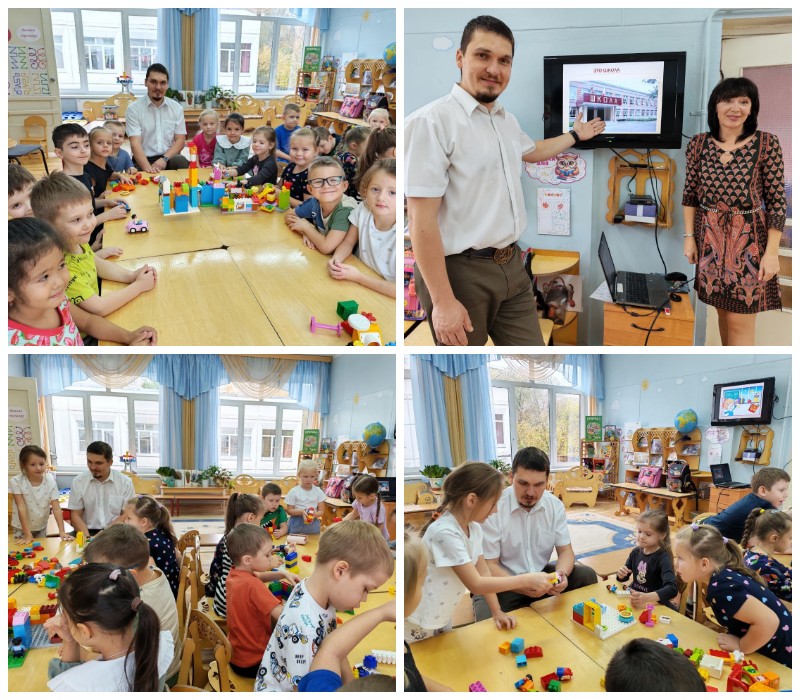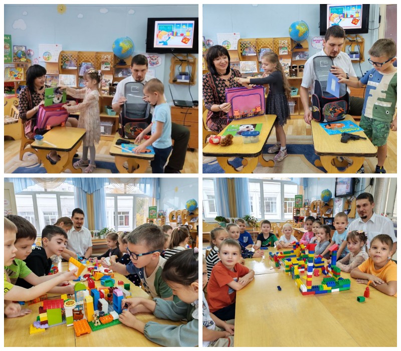 Александр Викторович пригласил дошколят в увлекательное путешествие по школе, рассказал им о классном кабинете, учениках, о школьных принадлежностях, показал ребятам инструменты, необходимые ему в работе: учебники, тетради, доска, мел, указка. Дети узнали, как нужно вести себя в школе. Затем Александр Викторович провел с ребятами игру на внимание «Собери портфель школьника» и затем все вместе сконструировали школу.