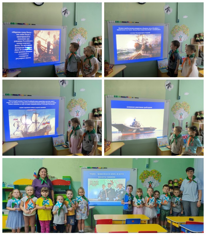 Дети узнали, как царь Петр I постигал азы кораблестроения, будучи простым плотником. Они также узнали об основании российского военного флота и о том, какие корабли сейчас охраняют нашу страну. Ребята познакомились с андреевским флагом и сделали его своими руками.