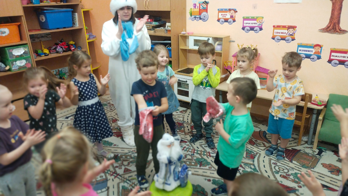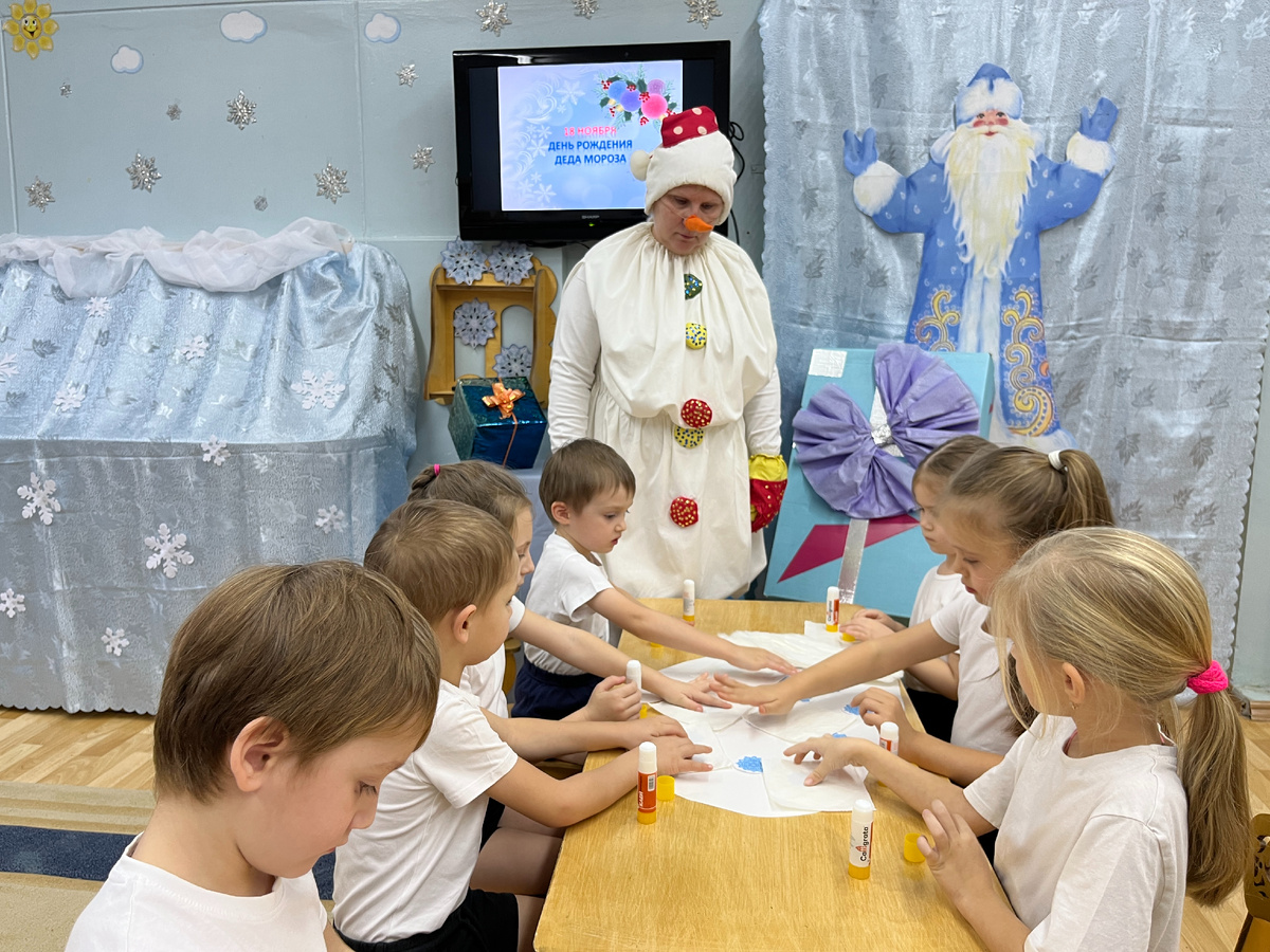 Воспитанники дошкольных групп №1-4, №3-4 и №4-4 вместе с героями Снеговиком, Елочкой, Метелицей играли в веселые игры, танцевали и готовили подарки для зимнего гостя. Для Дедушки Мороза они сделали волшебные рукавички, нарисовали портрет и сделали много-много снежинок и снежных комочков, чтоб Дедушке легче было проехать к детям на своих санях в новогоднюю ночь.