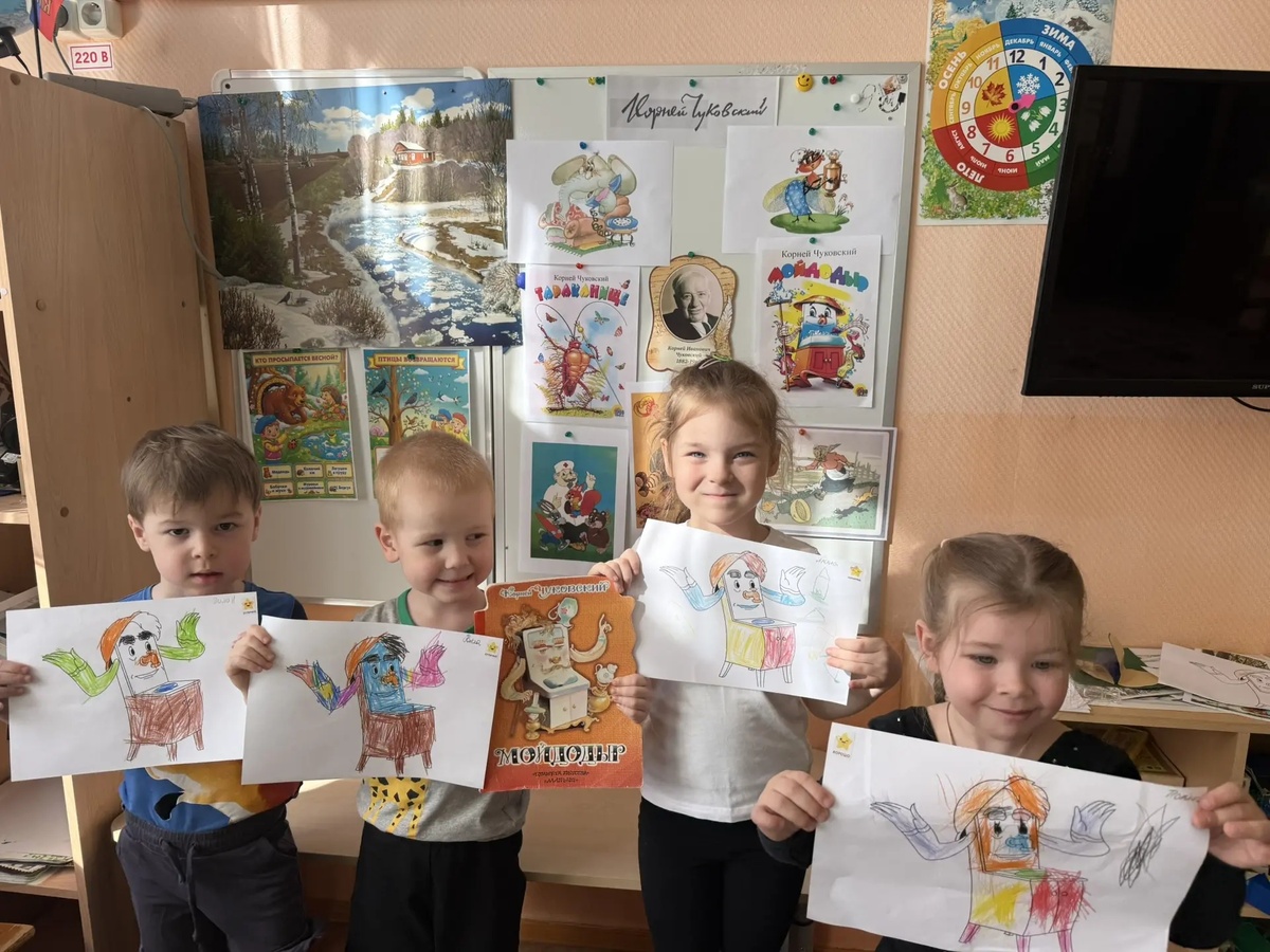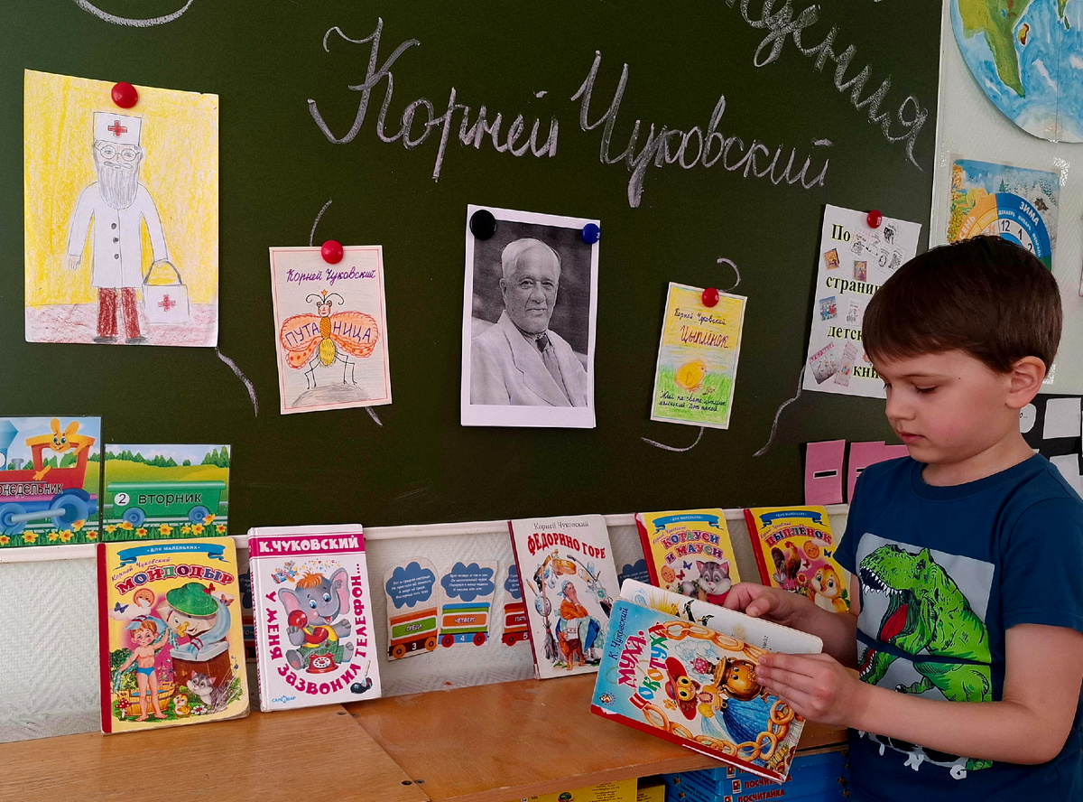 В группах оформили выставки произведений К.И.Чуковского, где ребята с удовольствием погружались в волшебный мир любимых историй про Муху-Цокотуху, Айболита, Мойдодыра и других ярких персонажей. Дети рассматривали красочные иллюстрации, вспоминали сюжеты, делились впечатлениями.